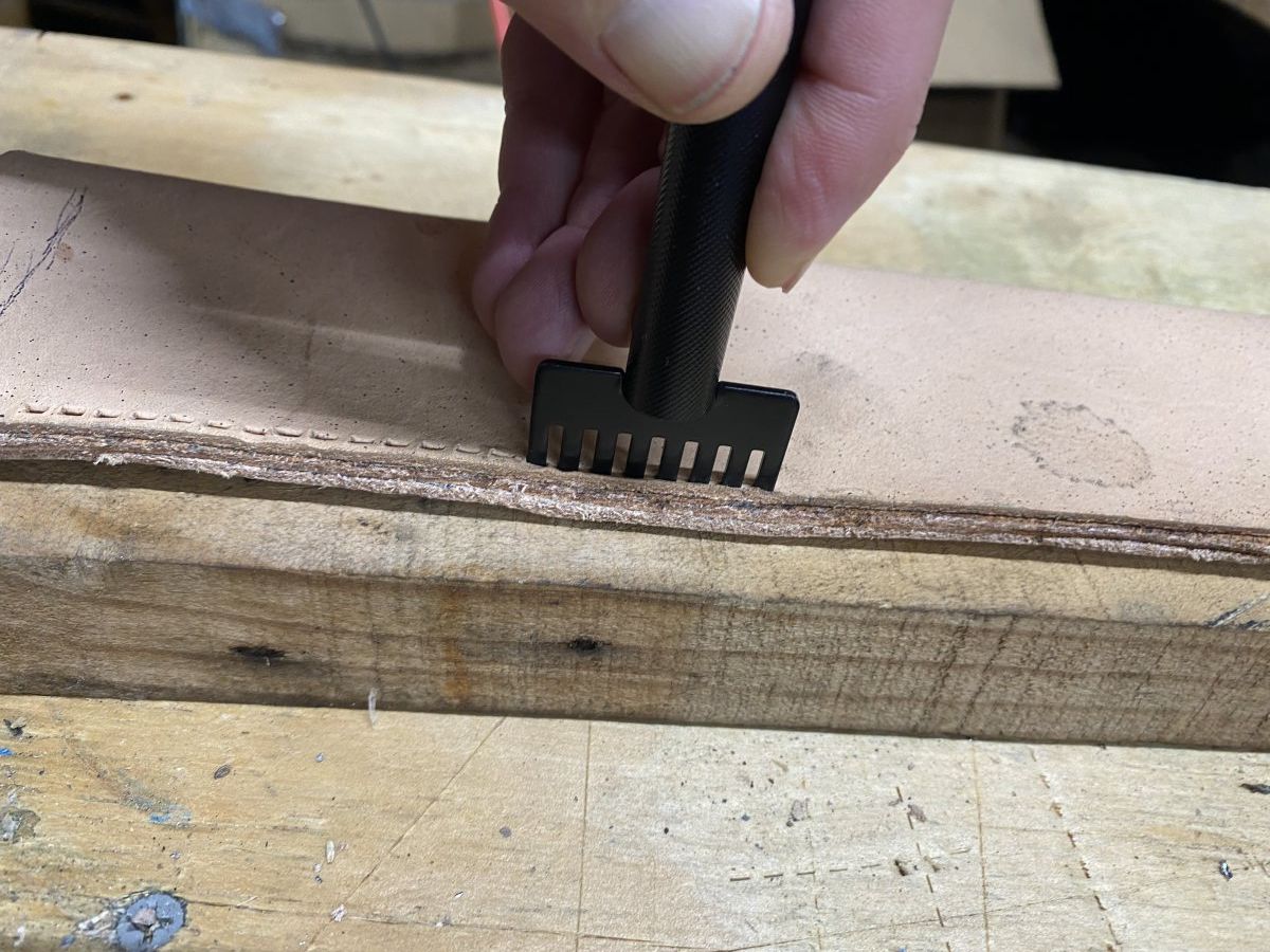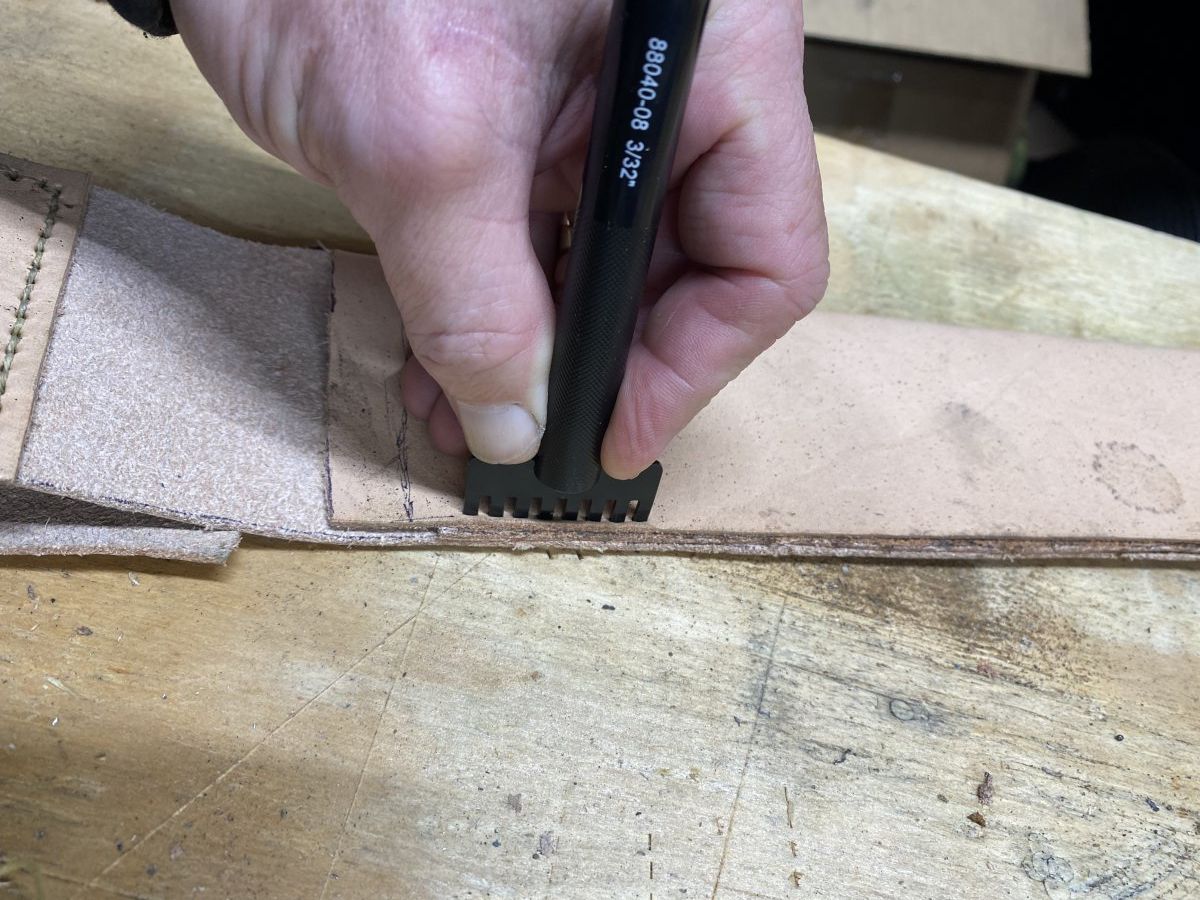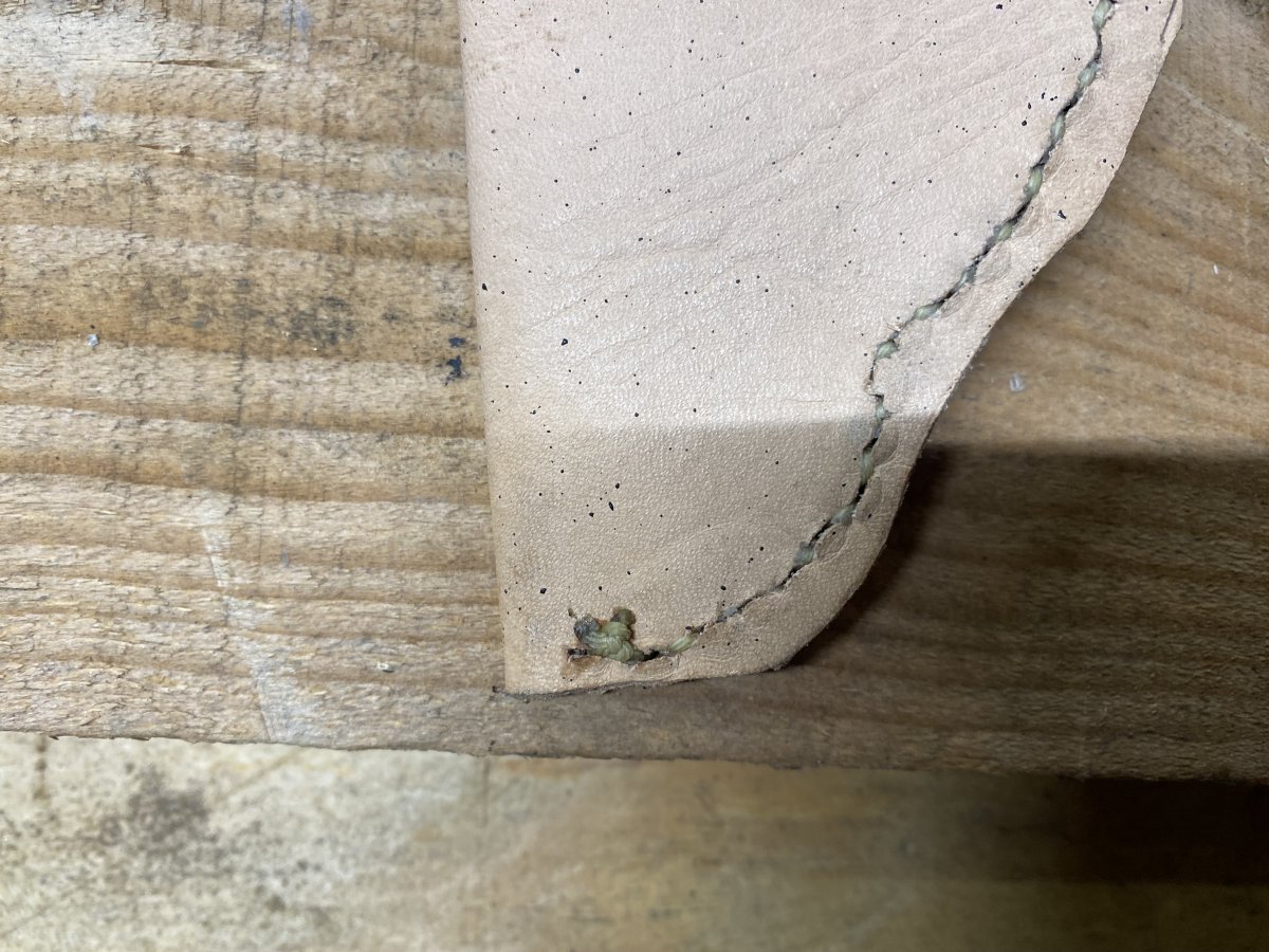 I should also mention that the welt had been cut and glued into place before I started getting pictures of the project. If you aren’t familiar with what a welt is, it is just a thin piece of leather that goes between the two pieces being sewn together. It adds extra space for the blade to slide in and out and it also protects the stitching by creating a barrier between the blade and the waxed string.