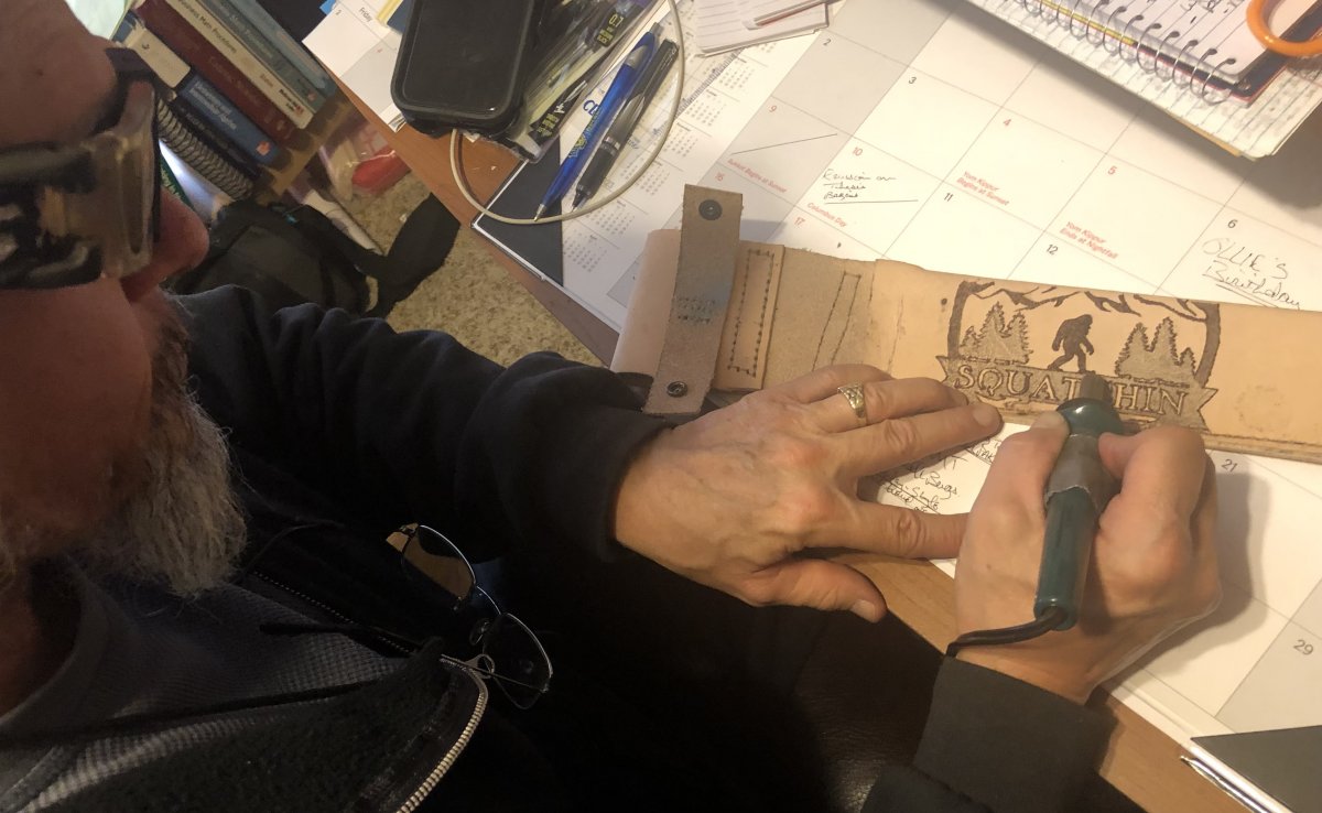 After transferring the image, I used my wood-burning tool/soldering iron with a fine tip on it to “burn” the image into the leather. I do this for two reasons: 1. I do not have the proper leather tools to work the image into the leather like the professional leatherworkers do, and 2. I just happened to have a woodburning tool available.