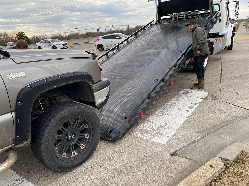 The tow truck finally arrived about 45 minutes later and slowly tugged the beached grey monster onto its silvery back. We signed some curious-looking papers and confirmed the final destination of the spent beast in Pryor, promised to pay them one of our collective kidneys, and WHOOSH! Off they went!