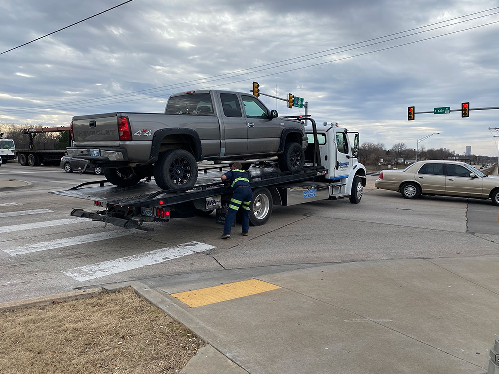 I was really surprised at the number of good Samaritans who offered to help us and it really kind of renewed my faith in the human condition. The tow truck finally arrived about 45 minutes later and slowly tugged the beached grey monster onto its silvery back. We signed some papers and confirmed the final destination in Pryor, promised to pay them one of our collective kidneys, and WHOOSH! Off they went!