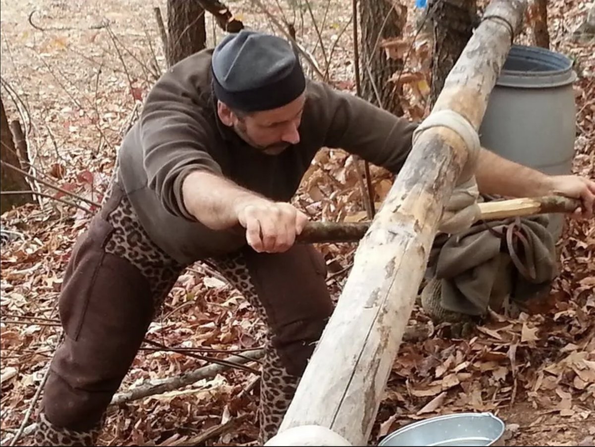 Next, wring it out on the wringing pole, then soak it again, wring it again, soak it again, wring it again…Do this 2-4 times, depending on your stamina, how big and thick your hide is, how big your arms are, and what sort of mood you are in. The key here is to get the brain solution to penetrate through the whole hide. This is one of the steps that wasn’t shown on the episode of Mountain Men but the one below is.