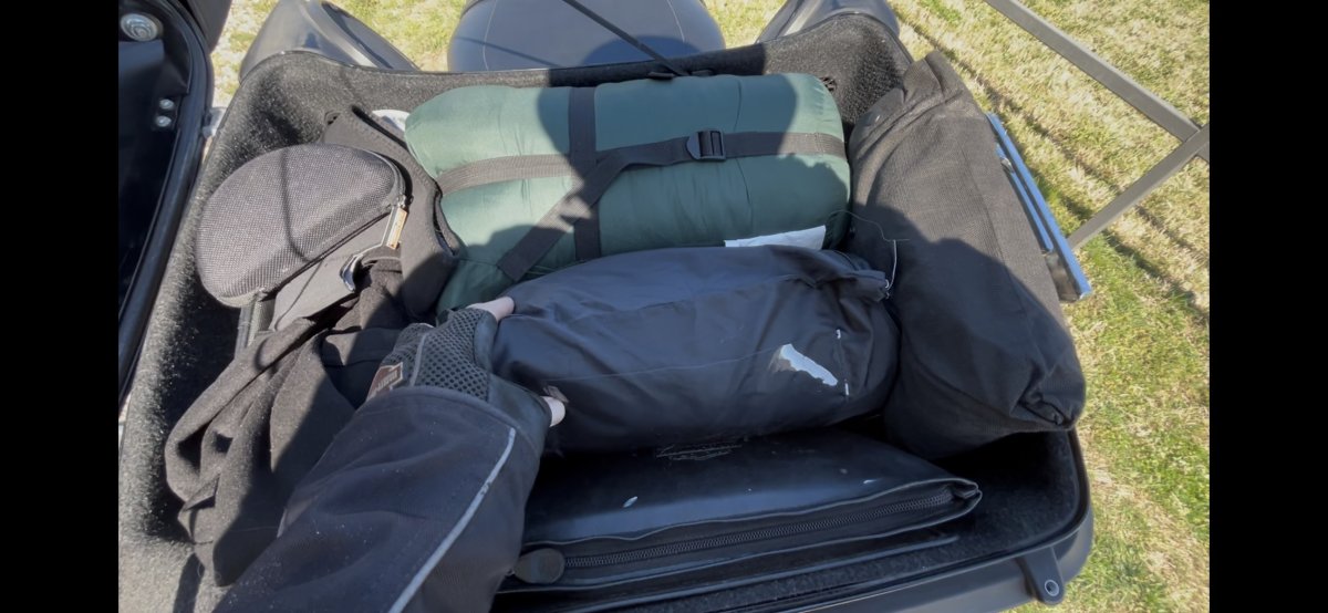As it stands, the Tour Pak gives me enough room for the sleeping bag, rain gear, propane fuel, air mattress, and pump, but after that the interior gets crowded fast. There is barely enough space left for gloves, glasses, and the smaller pieces of riding gear that always seem harmless until you are trying to find a place for them. I can strap the tent, an extra blanket, and a food container to the luggage rack, and I still have some real estate left on the passenger seat if I absolutely need it. But that opens up the larger question: how much do I truly need to bring, and how much can I simply pick up along the route? That is the real puzzle. Perishables, of course, will need to be replaced as I go, so I need to think less like a pack mule and more like a planner. Water is the obvious example. How much I carry at the start depends entirely on where I am headed. Crossing dry, empty country demands a different calculation than moving through greener, better-supplied stretches. That is where thoughtful pre-trip planning stops being optional and starts becoming the whole game.
