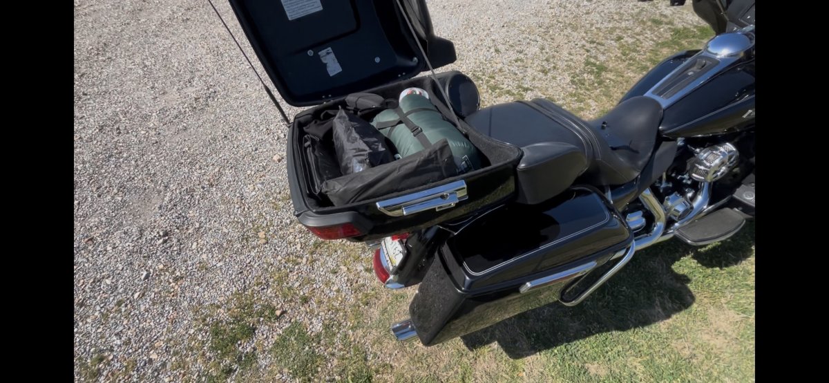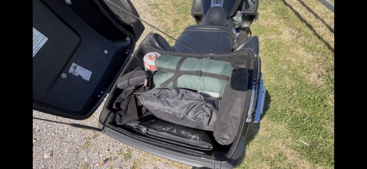 As it stands, the Tour Pak gives me enough room for the sleeping bag, rain gear, propane fuel, air mattress, and pump, but after that the interior gets crowded fast.